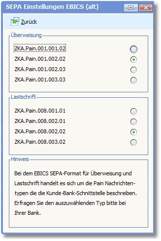 Durch Aktivierung des entsprechenden Radiobuttons wählen Sie hier das Format für SEPA-Überweisungen bzw. SEPA-Lastschriften.