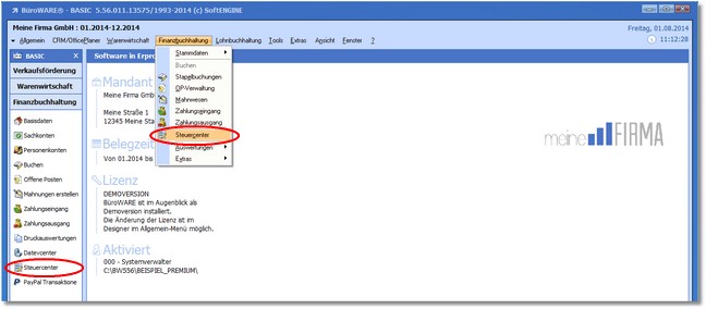 1.Klicken Sie mit der Maus im Hauptmenü auf "Finanzbuchhaltung > Steuercenter"