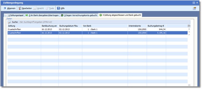 Die Karteikarte "Zahlung abgeschlossen und Bank gebucht"
