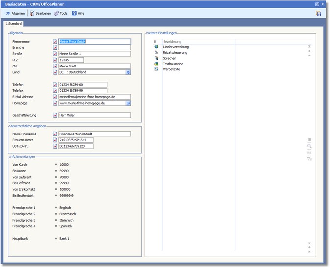 Die Basisdaten - CRM/OfficePlaner werden geöffnet.