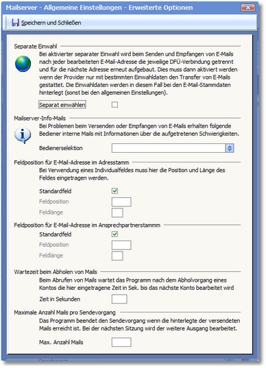 Diese Option muss nur aktiviert werden, wenn Ihr Provider den Transfer von E-Mails einer E-Mail-Adresse nur mit bestimmten Einwahldaten erlaubt. In diesem Fall werden auch die DFÜ-Verbindungsdaten bei der jeweiligen E-Mail-Adresse hinterlegt (siehe E-Mail-Konten).