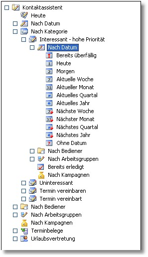 Mit Hilfe der der Navigation im Kontaktassistenten werden Wiedervorlagen bzw. Kontakte in der Tabelle angezeigt. Je nachdem, welche Auswahl Sie im Baum treffen, werden die Kontakte in der Tabelle gefiltert. Klicken Sie beispielweise auf "Heute", sind nur Kontakte sichtbar, die zum aktuellen Tagesdatum fällig sind, also als Wiedervorlagedatum das aktuelle Tagesdatum tragen.
