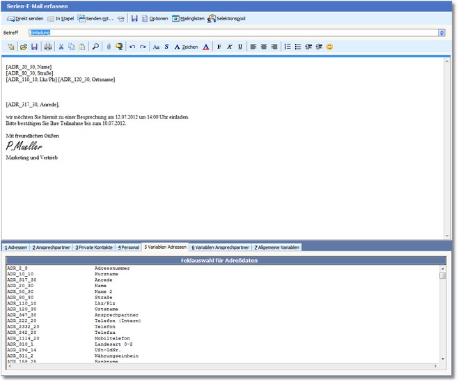 Text, der teilweise aus Variablen zusammengestellt ist. So können beispielsweise die Anrede und der Name aus dem Adressstamm übernommen werden, damit jede E-Mail richtig beginnt (Sehr geehrter Herr Maier; Sehr geehrte Frau Schmidt etc.).