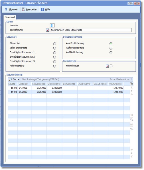 Navigation:  Finanzbuchhaltung > Stammdaten > Basisdaten > Steuerschlüssel >