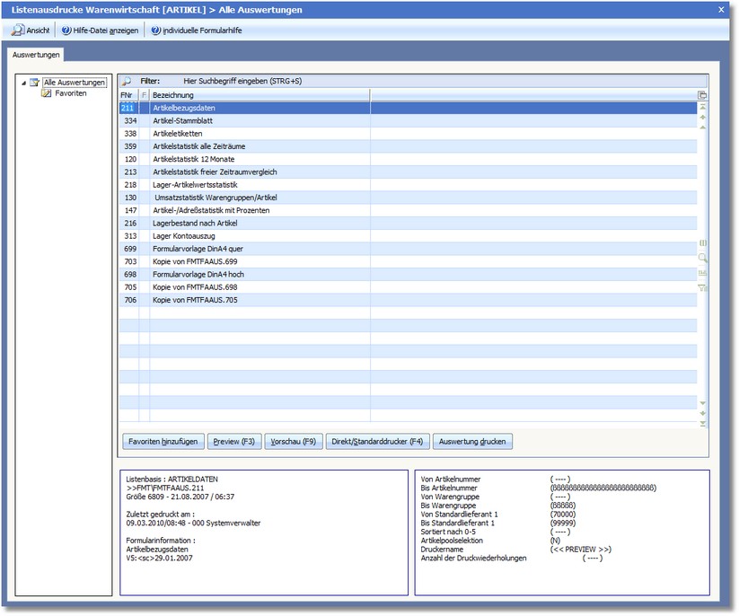 Dieser Programmpunkt stellt Ihnen in einem zentralen Dialog alle für den Artikelstamm verfügbaren Listauswertungen zum Ausdruck zur Verfügung.