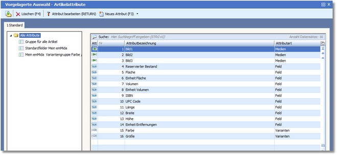 Die vorgelagerte Auswahltabelle der Artikelattribute wird geöffnet.