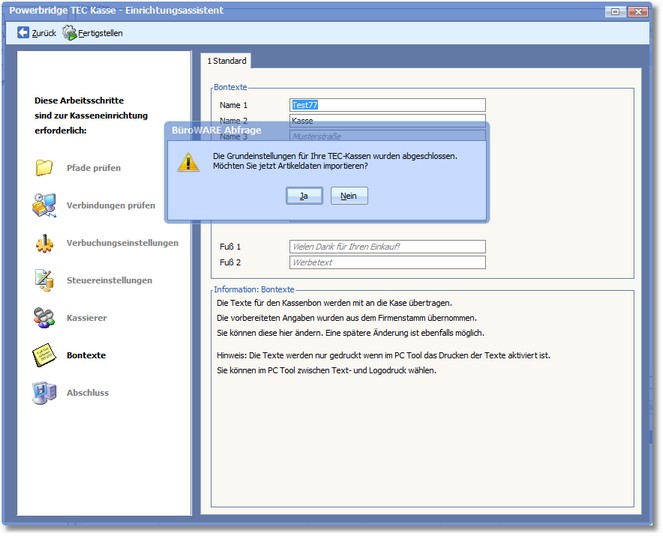<< Hier KLicken um eine Inhaltsübersicht anzuzeigen >> Navigation: BüroWARE Powerbridge > TEC-Kassenschnittstelle > BüroWARE-Schnittstelle einrichten > Abschluss |