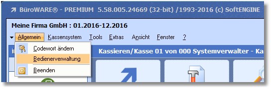 1. Klicken Sie im Hauptmenü des Kassensystems auf den Menüeintrag "Allgemein > Bedienerverwaltung".