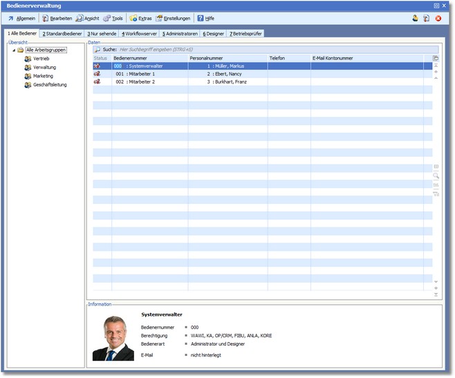 In der Bedienerverwaltung werden Bediener angelegt, bearbeitet und gelöscht. Den Bedienern können hier unter anderem auch lizenzabhängige Modulberechtigungen sowie Mandanten und Arbeitsgruppen zugewiesen werden.