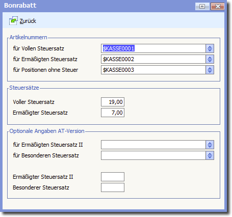 Dafür werden drei Artikel benötigt (mit Kontenzuordnungen für volle, ermäßigte und ohne Steuer) sowie die Prozentangaben für vollen und ermäßigten Steuersatz.