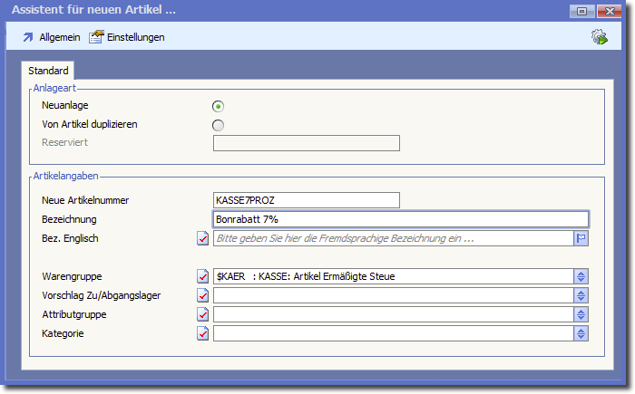 Hier ein Beispiel für die Artikelanlage
