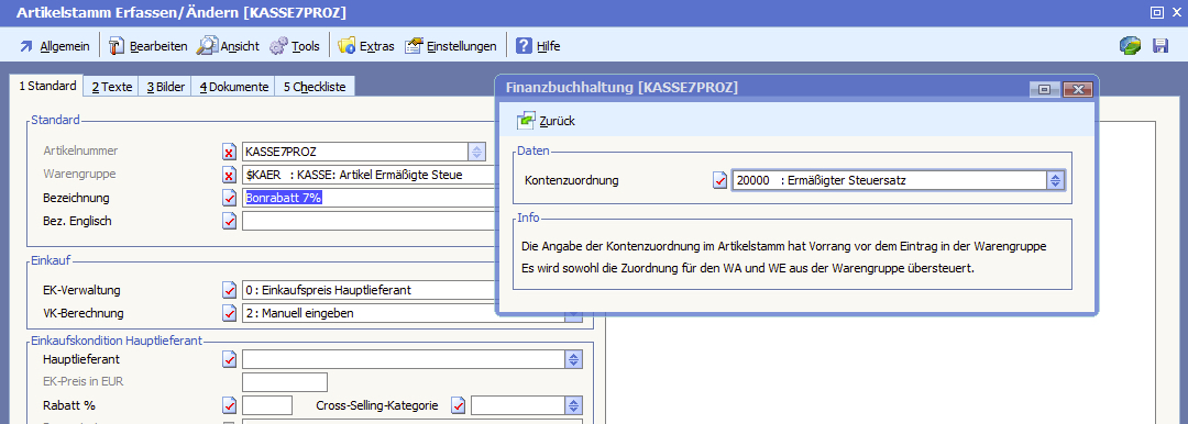 Die Erlös- und Aufwandsbuchungen der Kasse in der Finanzbuchhaltung werden über Artikel und den zugehörigen Kontenzuordnungen erzeugt.