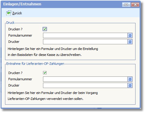 << Hier KLicken um eine Inhaltsübersicht anzuzeigen >> Navigation: Kassensystem > Technische Informationen (Systeminformation) > Vorbereitende Arbeiten > Grundeinrichtung der Kasse > Detaileinrichtung der Kasse (Basisdaten) > Kassenstammdaten > Kassenstammdaten erfassen/ändern > Die Karteikarte "Standard" > Karteikarte "Standard" - Menü > Einlagen/Entnahmen drucken |