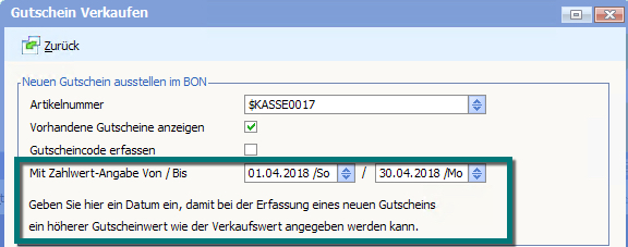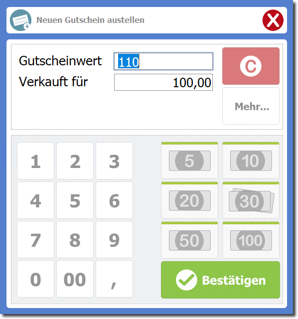 Beim Verkaufsvorgang kann jetzt der zu zahlende und der Wert des Gutscheins separat eingetragen werden.