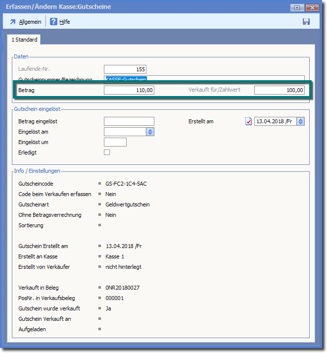 Beide Werte sind auch im Stammsatz des Gutscheins (Gutscheindatenbank) sichtbar.