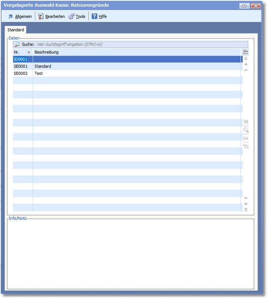 In diesem Dialog erfolgt die Verwaltung der Retourengründe, die bei einer Warenrücknahme für die Rücknahme hinterlegt werden können. Legen Sie hier eine Vorauswahl der Gründe an, die dann bei der Rücknahme gewählt und ggf. geändert werden können.
