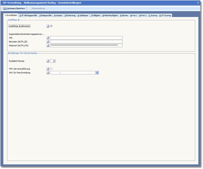 Damit werden die Felder zur Eingabe der Zugangsdaten und die Karteikarten "CP-Abfrageprofile" und "Risikoprofile" frei geschaltet.