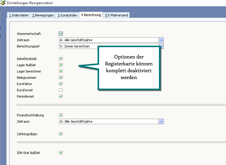 Um den Zeitaufwand zu reduzieren, kann hierbei die Registerkarte "Berechnungen" in den Eigenschaften der Reorganisation deaktiviert werden.