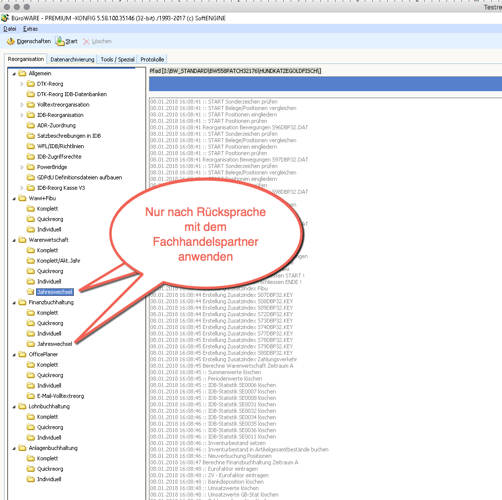Die ebenfalls vorhandene Reorganisation "Jahreswechsel" sollten Sie nur nach Rücksprache mit dem betreuenden Fachhandelspartner anwenden.