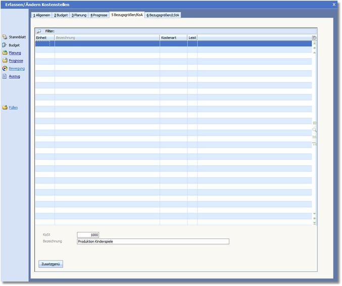 Um zu ermöglichen, dass eine Kostenstelle unterschiedliche Leistungen mit unterschiedlichen Bezugsgrößen abgeben kann, wird hier festgelegt, welche Kosten- bzw. Leistungsarten mit welcher Bezugsgröße auf andere Kostenstellen verrechnet werden. Bei Leistungsarten sind dabei die Leistungen anzugeben, welche die Kostenstelle von anderen Kostenstellen empfängt.