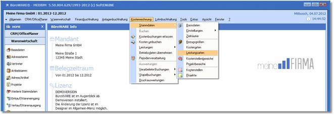 1. Klicken Sie mit der Maus im Hauptmenü auf "Kostenrechnung > Stammdaten > Leistungsarten".