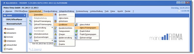 1. Klicken Sie mit der Maus im Hauptmenü auf "Warenwirtschaft > Stammdaten > Konditionen > Adress/Warengruppen".