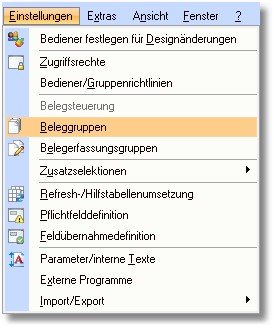 2. Klicken Sie im Designer mit der Maus im Hauptmenü auf "Einstellungen > Beleggruppen".