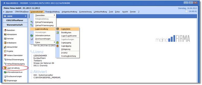 1. Klicken Sie mit der Maus im Hauptmenü auf "Warenwirtschaft > Lagerverwaltung > Lagerstamm".