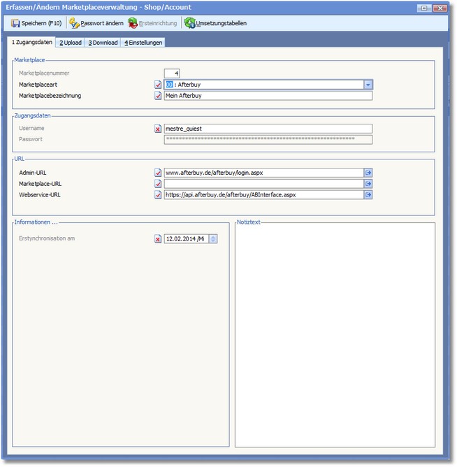 In der Marketplaceverwaltung können Sie Zugangsdaten verwalten, Einstellungen zu Upload und Download einsehen und bei Bedarf ändern.