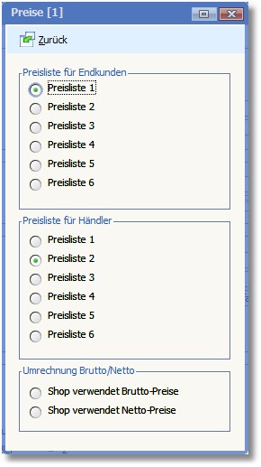 Hier legen Sie durch Aktivierung des entsprechenden Radiobuttons fest, welche Preisliste für Endkunden im Shop übertragen werden soll (Auswahl = 1-6).