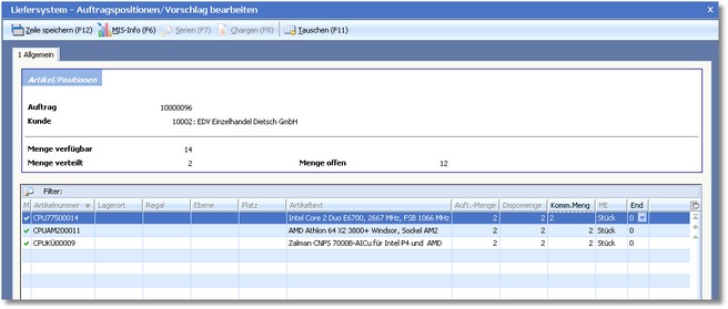Im Bearbeitungsdialog kommissionierter Aufträge wird vom Sachbearbeiter (Lagerist) die tatsächliche Liefermenge angegeben. Bei Serien- bzw. Chargenartikeln können zusätzlich die Seriennummern erfasst bzw. geändert werden. Weitere Funktionen dieses Dialoges sind das Tauschen von Artikeln und das Setzen eines Endauslieferkennzeichens, wenn das Programm keinen Rückstand bilden soll.