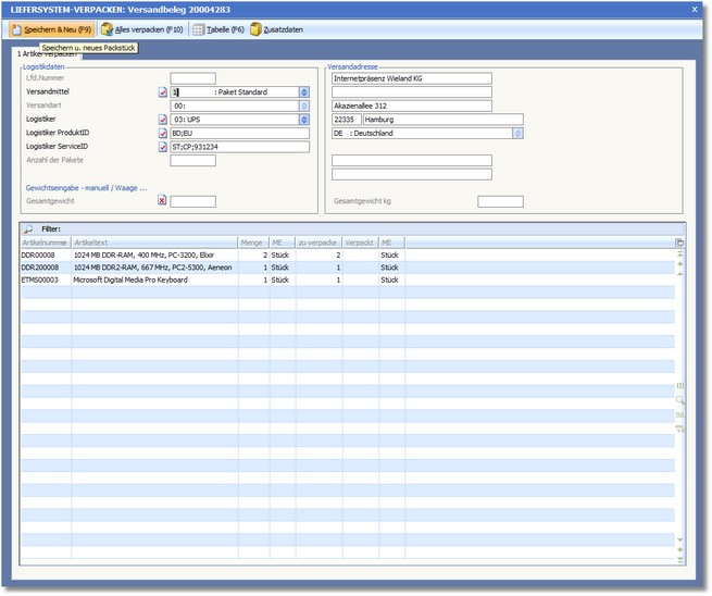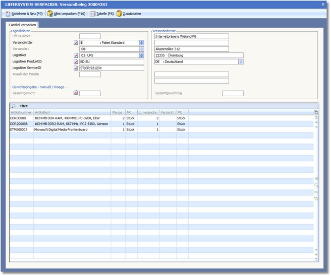 5. Die Positionen können auf mehrere Versandmittel verteilt werden. Wenn ein Versandmittel voll gepackt ist, können Sie mit dem Symbolbutton <Speichern & Neu> ein weiteres Versandmittel für diesen Beleg erstellen.