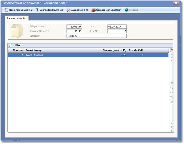 Sind alle Positionen verpackt, erscheint zum Abschluss eine Übersicht der Versandmittel, welche Sie im Anschluss mit [ESC] wieder verlassen können.