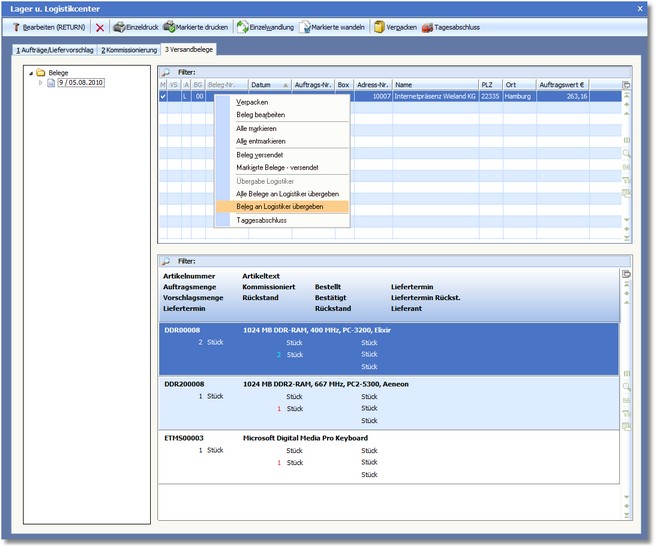 8. Um den Beleg nun an den Logistiker zu übergeben, rufen Sie mit der rechten Maustaste auf dem entsprechenden Beleg das Kontextmenü auf und wählen Sie den Menüpunkt <Beleg an Logistiker übergeben>