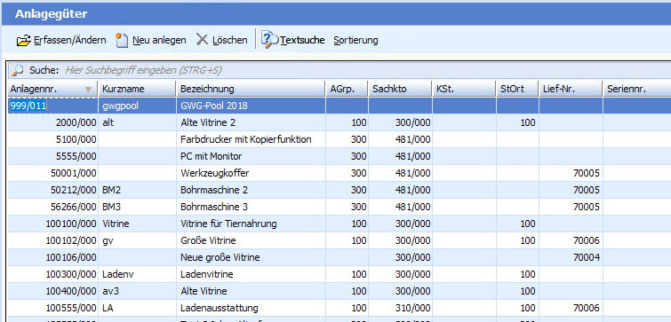 Den Dialog zur Verwaltung von Wirtschaftsgütern erreichen Sie im Hauptmenü über „Anlagenbuchhaltung > Buchungen". Über eine vorgelagerte Auswahltabelle können Sie ein neues Anlagegut anlegen oder ein Bestehendes ändern.