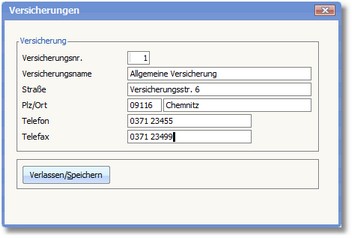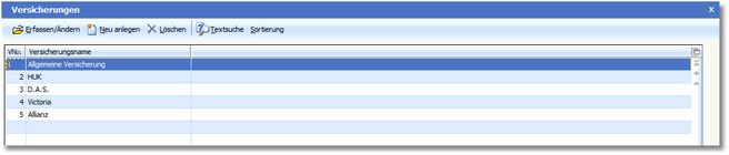 Mit der [F3]-Taste oder dem Button <Neu anlegen> wird eine neue Versicherung angelegt. Mit der [RETURN]-Taste können Sie einen bestehenden Datensatz bearbeiten.