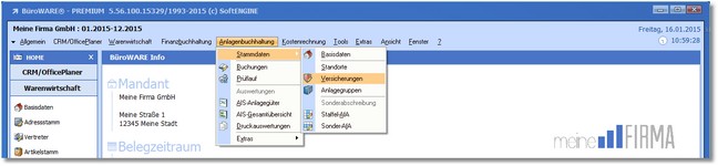 1. Klicken Sie mit der Maus im Hauptmenü auf "Anlagenbuchhaltung > Stammdaten > Versicherungen".