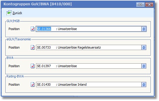 In erfolgswirksamen Konten, bspw. Konto 8410 (Umsatzerlöse) wurden die Kontogruppen GuV/BWA hinterlegt. Diese können über den Menüeintrag "Bearbeiten > Optionen/Parameter > Kontogruppen > Kontogruppen GuV/BWA" bearbeitet werden.