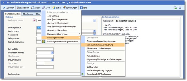 1. Wählen Sie in der Buchungsmaske den Menüpunkt "Tools > Buchungen erstellen > Vorsteuerermittlung/Umbuchung".