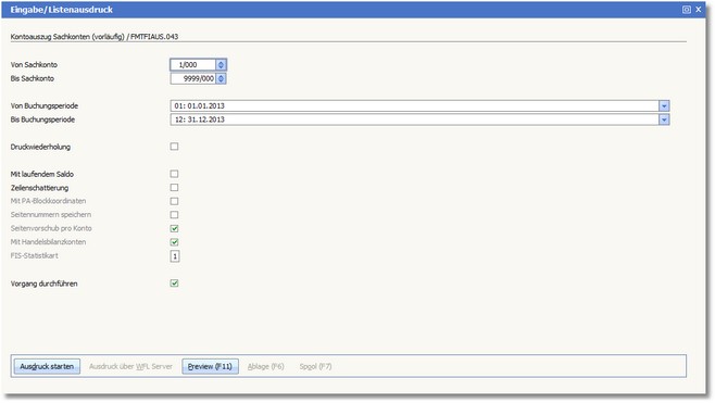 Wenn für ein Einschränkungskriterium (z.B. "Von Sachkonto") nichts eingegeben wird, bedeutet dies "keine Einschränkung". Es werden dann, um beim Beispiel zu bleiben, alle Sachkonten gedruckt.