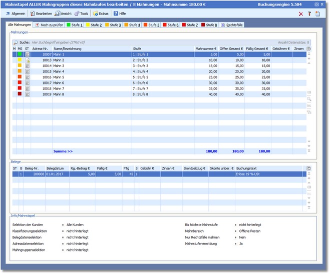 Mahnungen werden in Stapeln verwaltet. Der Bearbeitungsdialog bietet viele nützliche Funktionen rund um die Mahnung und den Kunden.