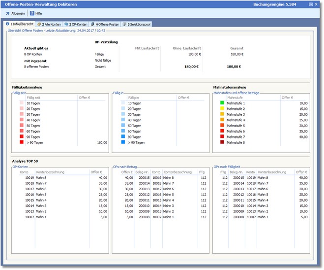 Durch die Buchung der Rechnungsein- und Rechnungsausgänge werden "Offene Posten" erstellt. Diese "Offenen Posten" entsprechen in Ihrer Art den Rechnungen und Gutschriften für erworbene oder gelieferte Waren und Leistungen. Die OPs stellen aber zusätzlich noch detaillierte Informationen über den Zahlungsfluss zur Verfügung. Dies beinhaltet die Angaben zu den geleisteten Zahlungen, die Angaben zum Mahnwesen und zum Fremdwährungsbereich.