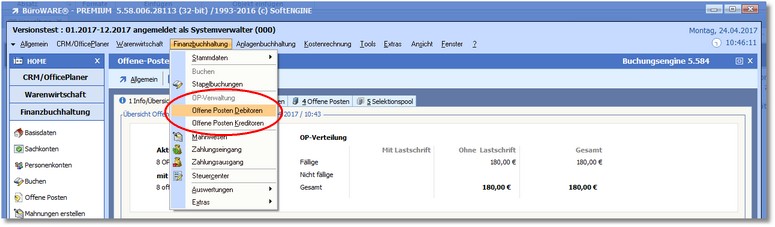 1.Klicken Sie mit der Maus im Hauptmenü auf "Finanzbuchhaltung > OP-Verwaltung - Offene Posten Debitoren"