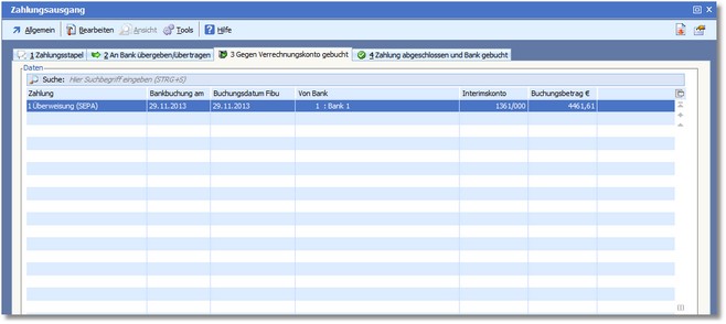 Bei der Erfassung der Kontoauszüge ist diese Überweisung gegen das Interimskonto zu buchen und dieser Transaktion zu zuweisen. Danach erfolgt die automatische Verschiebung in die Karteikarte "4 Zahlungen abgeschlossen und Bank gebucht".