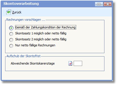 Legen Sie hier fest, welche Rechnungen beim Zahlungsvorschlag berücksichtigt werden sollen. Weiterhin können Sie hier auch abweichende Skontokarenztage für Ihre Kunden festlegen.