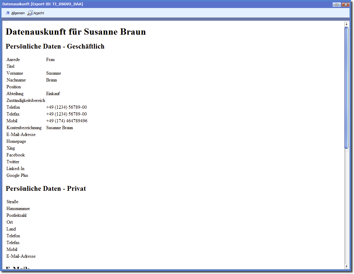 Über das Menü „Allgemein ➜ Drucken“ kann die Datenauskunft an einen Drucker übergeben und beispielsweise mittels des PDF-Mailers in eine PDF-Datei gewandelt und versandt werden.