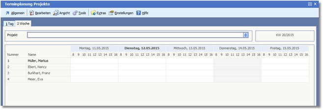 Die Registerkarte "Woche" ist hier ebenfalls in zwei Bereiche unterteilt. Im oberen Bereich können Sie mit der [F5]-Taste jeweils DATUM und PROJEKT auswählen.