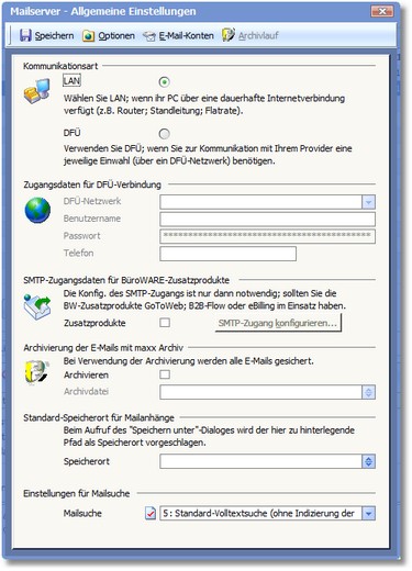 In den Grundeinstellungen des Mailassistenten müssen Sie Angaben zur Art des vorhandenen Internetzugangs hinterlegen.