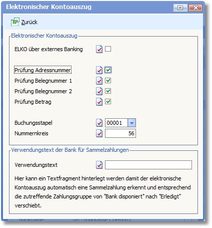 Wird dieses Feld aktiviert, erfolgt die Abprüfung des Betrags beim Einlesen des Elektronischen Kontoauszugs. Ist dieses Feld deaktiviert, erfolgt keine Berücksichtigung des Betrags bei der Abprüfung der Buchungsfähigkeit im Elektronischen Kontoauszug.