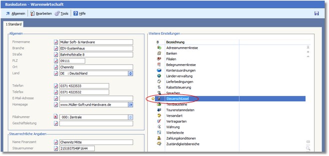 2. Im Bereich "Weitere Einstellungen" doppelklicken Sie nun auf den Eintrag "Steuerschlüssel".